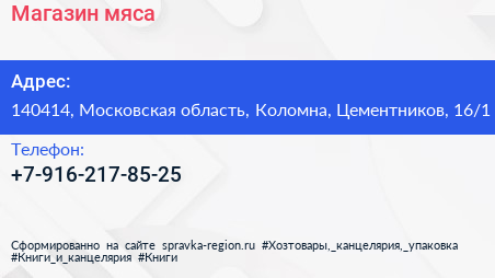 Магазин мяса по адресу 140414, Московская область, Коломна, Цементников, 16/1 в дальнейшем Организация, размещена в следующих категориях: