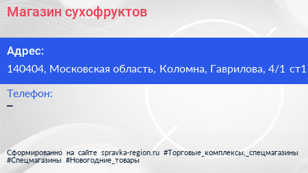 Магазин сухофруктов по адресу 140404, Московская область, Коломна, Гаврилова, 4/1 ст1 в дальнейшем Организация, размещена в следующих категориях: