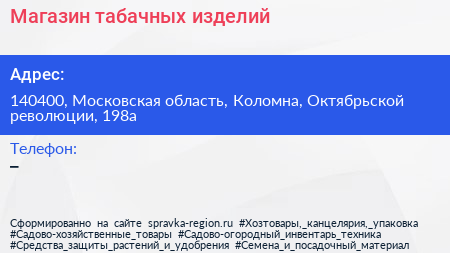 Магазин табачных изделий по адресу 140400, Московская область, Коломна, Октябрьской революции, 198а в дальнейшем Организация, размещена в следующих категориях: