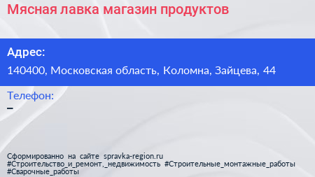 Мясная лавка, магазин продуктов по адресу 140400, Московская область, Коломна, Зайцева, 44 в дальнейшем Организация, размещена в следующих категориях: