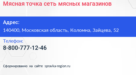 Мясная точка, сеть мясных магазинов по адресу 140400, Московская область, Коломна, Зайцева, 52 в дальнейшем Организация, размещена в следующих категориях: