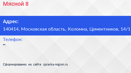 Мясной №8 по адресу 140414, Московская область, Коломна, Цементников, 14/1 в дальнейшем Организация, размещена в следующих категориях: