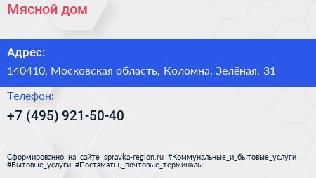 Мясной дом по адресу 140410, Московская область, Коломна, Зелёная, 31 в дальнейшем Организация, размещена в следующих категориях: