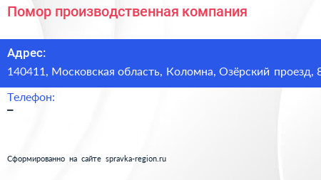 Помор, производственная компания по адресу 140411, Московская область, Коломна, Озёрский проезд, 8 в дальнейшем Организация, размещена в следующих категориях: