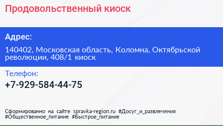 Продовольственный киоск по адресу 140402, Московская область, Коломна, Октябрьской революции, 408/1 киоск в дальнейшем Организация, размещена в следующих категориях: