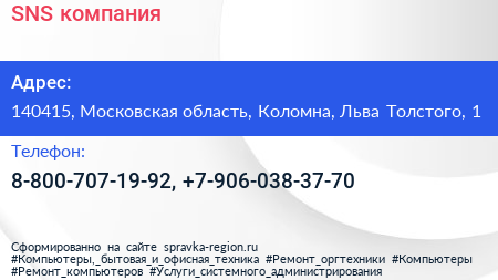 SNS, компания по адресу 140415, Московская область, Коломна, Льва Толстого, 1 в дальнейшем Организация, размещена в следующих категориях: