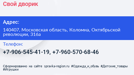 Свой дворик по адресу 140407, Московская область, Коломна, Октябрьской революции, 316а в дальнейшем Организация, размещена в следующих категориях: