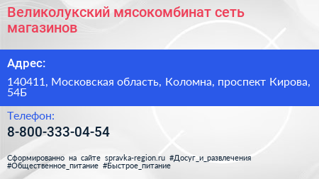 Великолукский мясокомбинат, сеть магазинов по адресу 140411, Московская область, Коломна, проспект Кирова, 54Б в дальнейшем Организация, размещена в следующих категориях: