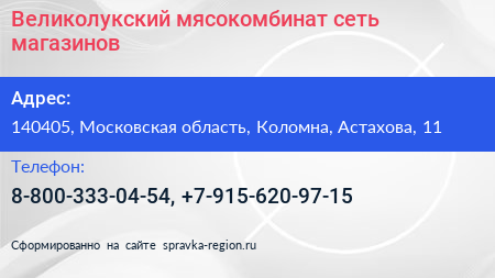 Великолукский мясокомбинат, сеть магазинов по адресу 140405, Московская область, Коломна, Астахова, 11 в дальнейшем Организация, размещена в следующих категориях: