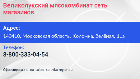 Великолукский мясокомбинат, сеть магазинов по адресу 140410, Московская область, Коломна, Зелёная, 11а в дальнейшем Организация, размещена в следующих категориях: