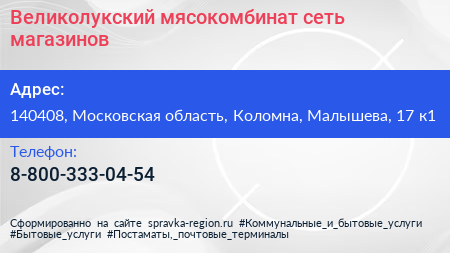 Великолукский мясокомбинат, сеть магазинов по адресу 140408, Московская область, Коломна, Малышева, 17 к1 в дальнейшем Организация, размещена в следующих категориях: