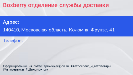 Boxberry, отделение службы доставки по адресу 140410, Московская область, Коломна, Фрунзе, 41 в дальнейшем Организация, размещена в следующих категориях: