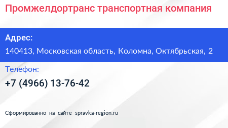 Промжелдортранс, транспортная компания по адресу 140413, Московская область, Коломна, Октябрьская, 2 в дальнейшем Организация, размещена в следующих категориях: