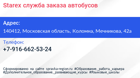 Starex, служба заказа автобусов по адресу 140412, Московская область, Коломна, Мечникова, 42а в дальнейшем Организация, размещена в следующих категориях:
