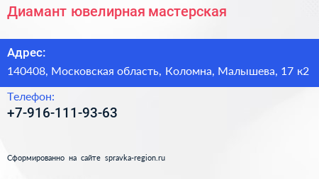 Диамант, ювелирная мастерская по адресу 140408, Московская область, Коломна, Малышева, 17 к2 в дальнейшем Организация, размещена в следующих категориях: