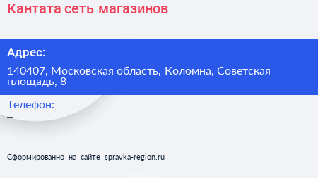 Кантата, сеть магазинов по адресу 140407, Московская область, Коломна, Советская площадь, 8 в дальнейшем Организация, размещена в следующих категориях: