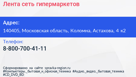 Лента, сеть гипермаркетов по адресу 140405, Московская область, Коломна, Астахова, 4 к2 в дальнейшем Организация, размещена в следующих категориях: