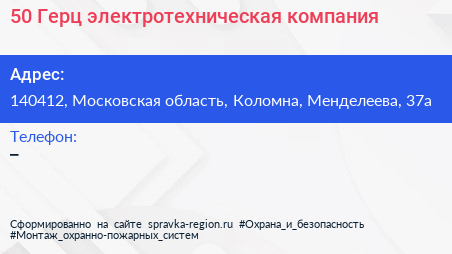 50 Герц, электротехническая компания по адресу 140412, Московская область, Коломна, Менделеева, 37а в дальнейшем Организация, размещена в следующих категориях: