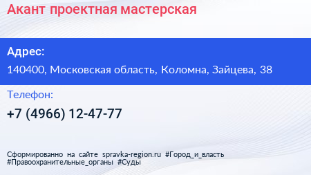 Акант, проектная мастерская по адресу 140400, Московская область, Коломна, Зайцева, 38 в дальнейшем Организация, размещена в следующих категориях: