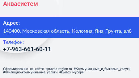 Аквасистем+ по адресу 140400, Московская область, Коломна, Яна Грунта, вл8 в дальнейшем Организация, размещена в следующих категориях: