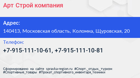 Арт Строй, компания по адресу 140413, Московская область, Коломна, Щуровская, 20 в дальнейшем Организация, размещена в следующих категориях: