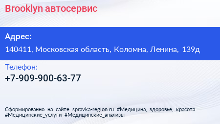 Brooklyn, автосервис по адресу 140411, Московская область, Коломна, Ленина, 139д в дальнейшем Организация, размещена в следующих категориях: