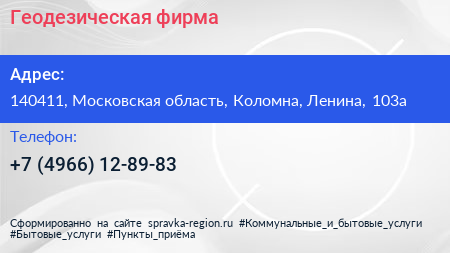 Геодезическая фирма по адресу 140411, Московская область, Коломна, Ленина, 103а в дальнейшем Организация, размещена в следующих категориях: