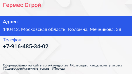 Гермес Строй по адресу 140412, Московская область, Коломна, Мечникова, 38 в дальнейшем Организация, размещена в следующих категориях: