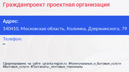 Гражданпроект, проектная организация по адресу 140410, Московская область, Коломна, Дзержинского, 79 в дальнейшем Организация, размещена в следующих категориях:
