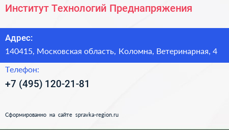 Институт Технологий Преднапряжения по адресу 140415, Московская область, Коломна, Ветеринарная, 4 в дальнейшем Организация, размещена в следующих категориях: