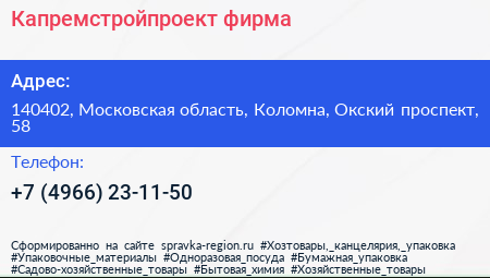 Капремстройпроект, фирма по адресу 140402, Московская область, Коломна, Окский проспект, 58 в дальнейшем Организация, размещена в следующих категориях:
