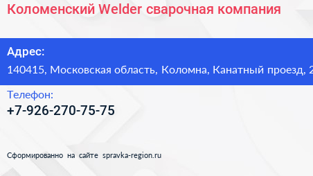 Коломенский Welder, сварочная компания по адресу 140415, Московская область, Коломна, Канатный проезд, 2 в дальнейшем Организация, размещена в следующих категориях: