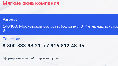 Мягкие окна, компания по адресу 140400, Московская область, Коломна, 3 Интернационала, 8 в дальнейшем Организация, размещена в следующих категориях: