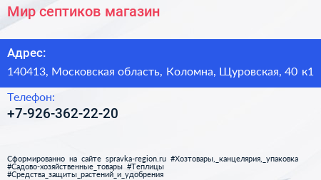 Мир септиков, магазин по адресу 140413, Московская область, Коломна, Щуровская, 40 к1 в дальнейшем Организация, размещена в следующих категориях: