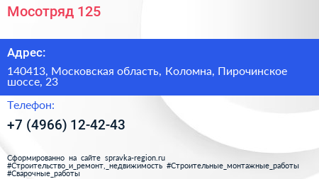 Мосотряд-125 по адресу 140413, Московская область, Коломна, Пирочинское шоссе, 23 в дальнейшем Организация, размещена в следующих категориях: