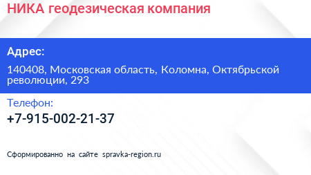 НИКА, геодезическая компания по адресу 140408, Московская область, Коломна, Октябрьской революции, 293 в дальнейшем Организация, размещена в следующих категориях: