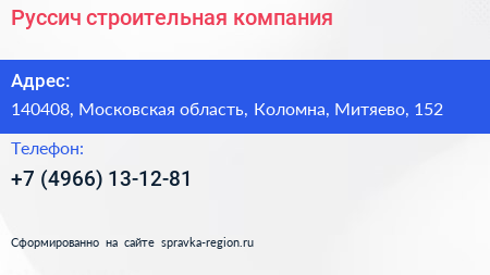 Руссич, строительная компания по адресу 140408, Московская область, Коломна, Митяево, 152 в дальнейшем Организация, размещена в следующих категориях: