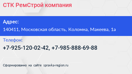 СТК РемСтрой, компания по адресу 140411, Московская область, Коломна, Макеева, 1а в дальнейшем Организация, размещена в следующих категориях: