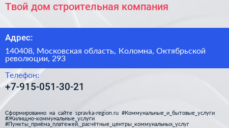 Твой дом, строительная компания по адресу 140408, Московская область, Коломна, Октябрьской революции, 293 в дальнейшем Организация, размещена в следующих категориях: