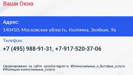 Ваши Окна по адресу 140410, Московская область, Коломна, Зелёная, 9а в дальнейшем Организация, размещена в следующих категориях: