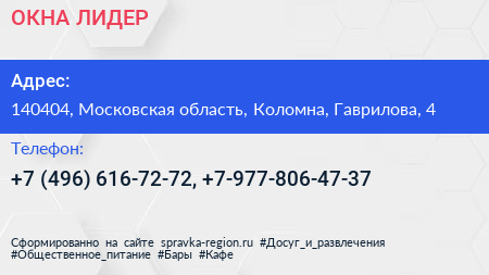 ОКНА ЛИДЕР по адресу 140404, Московская область, Коломна, Гаврилова, 4 в дальнейшем Организация, размещена в следующих категориях: