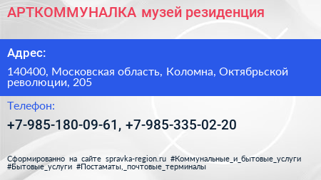 АРТКОММУНАЛКА, музей-резиденция по адресу 140400, Московская область, Коломна, Октябрьской революции, 205 в дальнейшем Организация, размещена в следующих категориях: