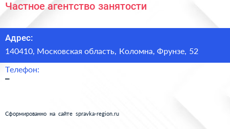 Частное агентство занятости по адресу 140410, Московская область, Коломна, Фрунзе, 52 в дальнейшем Организация, размещена в следующих категориях: