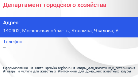 Департамент городского хозяйства по адресу 140402, Московская область, Коломна, Чкалова, 6 в дальнейшем Организация, размещена в следующих категориях: