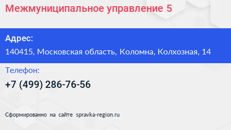 Межмуниципальное управление №5 по адресу 140415, Московская область, Коломна, Колхозная, 14 в дальнейшем Организация, размещена в следующих категориях: