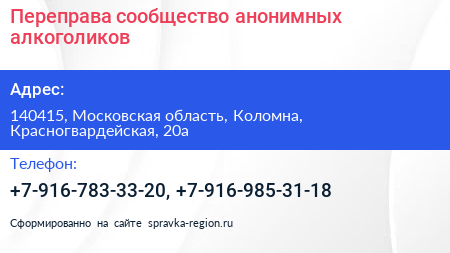 Переправа, сообщество анонимных алкоголиков по адресу 140415, Московская область, Коломна, Красногвардейская, 20а в дальнейшем Организация, размещена в следующих категориях: