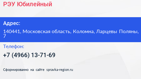 РЭУ Юбилейный по адресу 140441, Московская область, Коломна, Ларцевы Поляны, 7 в дальнейшем Организация, размещена в следующих категориях: