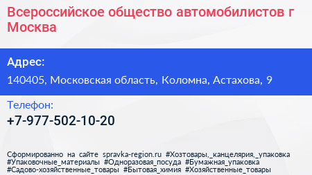 Всероссийское общество автомобилистов, г. Москва по адресу 140405, Московская область, Коломна, Астахова, 9 в дальнейшем Организация, размещена в следующих категориях:
