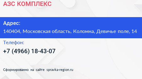 АЗС-КОМПЛЕКС по адресу 140404, Московская область, Коломна, Девичье поле, 14 в дальнейшем Организация, размещена в следующих категориях: