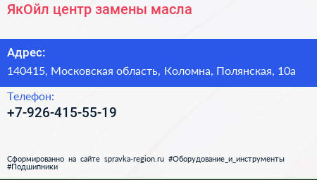 ЯкОйл, центр замены масла по адресу 140415, Московская область, Коломна, Полянская, 10а в дальнейшем Организация, размещена в следующих категориях: